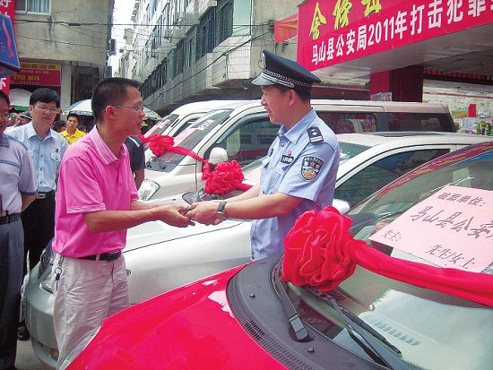 5月的一天晚上,都安的藍先生剛買不久的小車就被盜了。正當他懊惱之時,次日中午12時,馬山公安局民警利用衛通達GPS將他被盜的小轎車追回。在昨日上午的退贓現場,藍先生從民警手中接回愛車的鑰匙后,送上錦旗,以表示感謝?!爸儡囘M入馬山境內后,民警連夜追捕,太辛苦了!”藍先生說,車在都安縣被盜后,他馬上報了案,該縣民警通過車載的衛通達GPS定位系統顯示得知車已進入馬山縣境內。隨后,兩地警方通過信息共享,將其愛車追回。