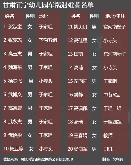 記者從甘肅省政府應急辦獲悉,該校車共載64人,其中司機、幼兒園教師各1人,幼兒62人。事故已造成20人死亡,其中1名校車司機和4名幼兒當場死亡,14名幼兒和1名教師受重傷經醫院搶救無效死亡,其余44名受傷幼兒中,重傷12人,輕傷32人。受傷幼兒正在慶陽市醫院和正寧縣醫院接受治療。