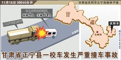 11月16日9時40分許,甘肅慶陽市正寧縣榆林子鎮發生一起重大交通事故,一輛車號為陜D72231的大翻斗運煤貨車與一輛榆林子鎮幼兒園校車迎面相撞。截至目前,事故已造成20人死亡,另有44人受傷。